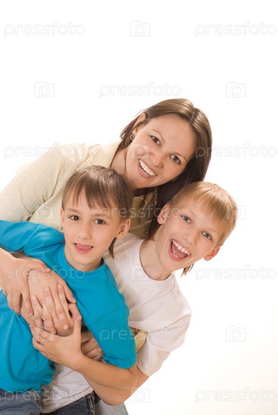 Счастливая мама с двумя сыновьями на белом фоне