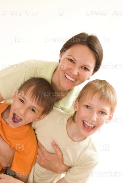 Счастливая мама с двумя сыновьями на белом фоне