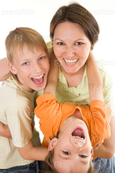 Счастливая мама с двумя сыновьями на белом фоне