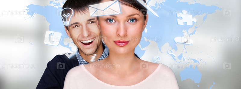 Женщина и мухчина на фоне карты мира с соединительными линиями. Концепция международной коммуникации