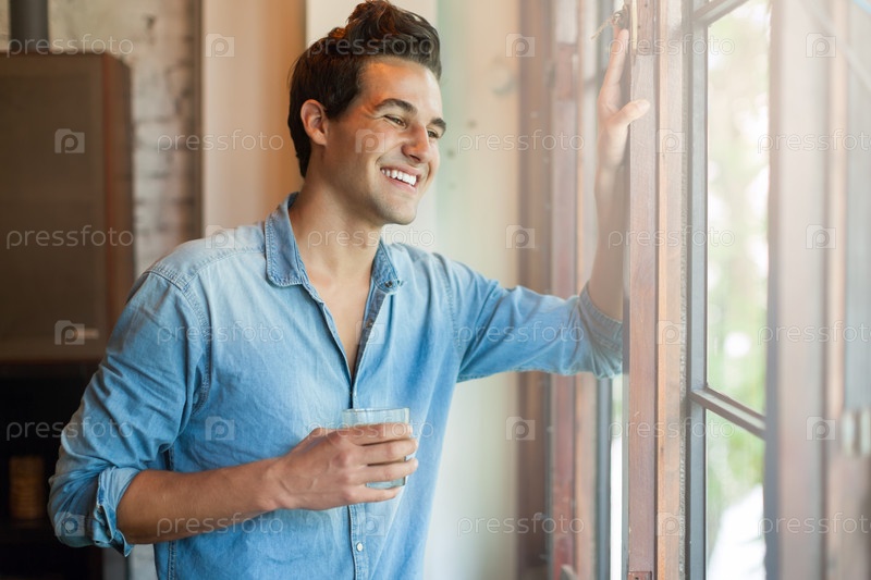 Счастливый мужчина смотрит в окно