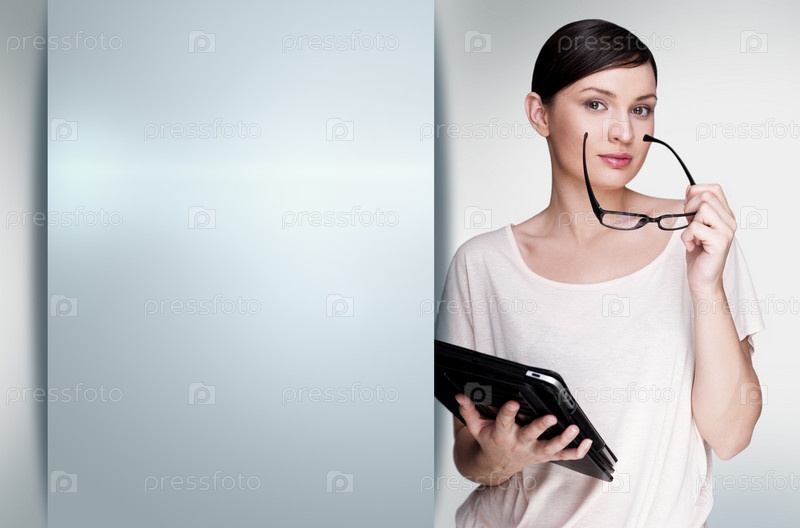 Женщина с планшетным компьютером стоит на сером металлическом фоне с местом для текста