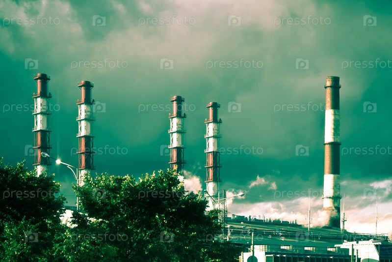 Трубы промышленных предприятий на фоне темного облачного неба