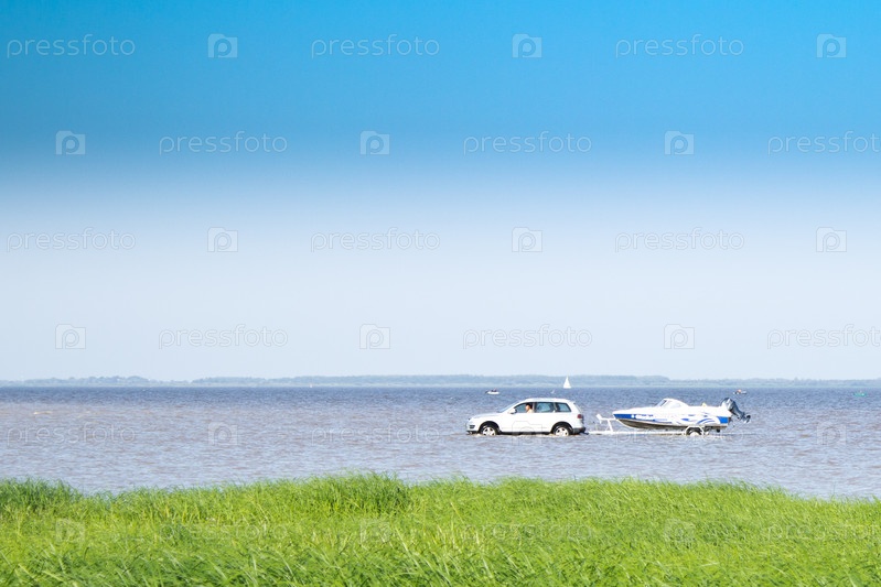 Автомобиль с катером в озере