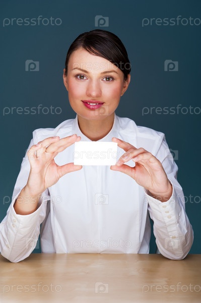 Улыбающаяся деловая женщина с чистой белой визитной карточкой в руках сидит за столом на синем фоне