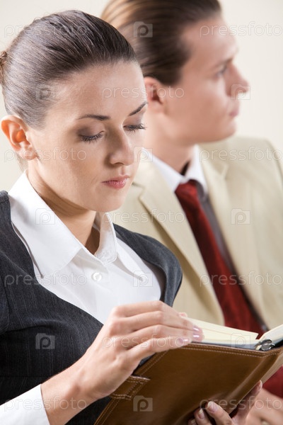 Изображение задумчивой бизнес-леди, которая смотрит в блокнот в руках с мужчиной на заднем плане