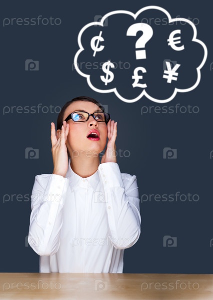 Деловая женщина думает о многих личных проблемах, сидя за столом на синем фоне