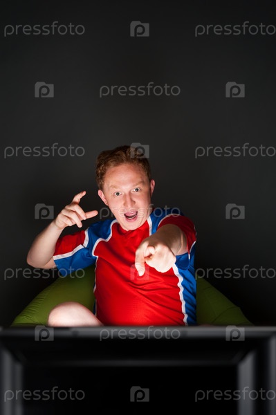 Фанат увлеченно смотрит игру своей любимой футбольной команды по телевизору в ночное время