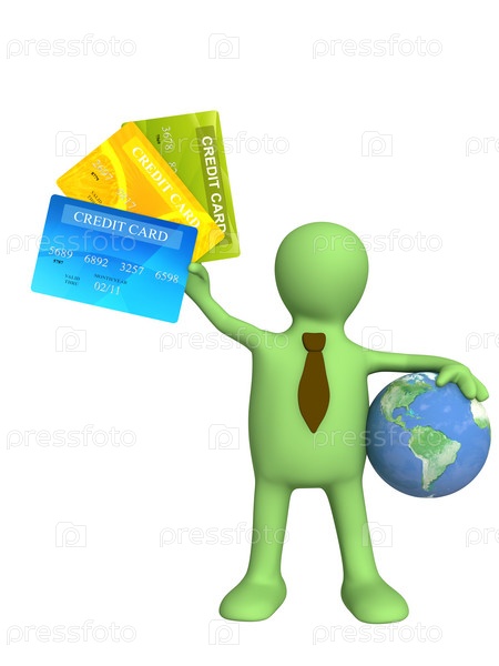 Маленький человек с глобусом и кредитными картами