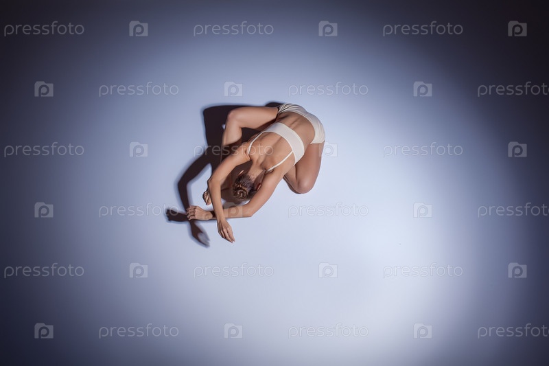 Молодая красивая танцовщица в бежевый Купальники, танцы на сиреневый фон