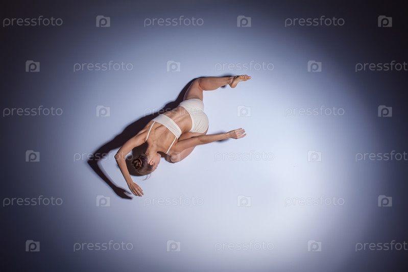 Молодая красивая танцовщица в бежевый Купальники, танцы на сиреневый фон