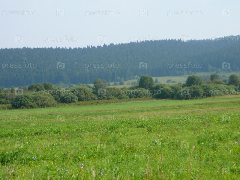 Луг, кусты и лес в дымке