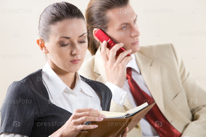 Портрет красивой сотрудницы, глядящей в блокнот на фоне мужчины, разговаривающего по телефону