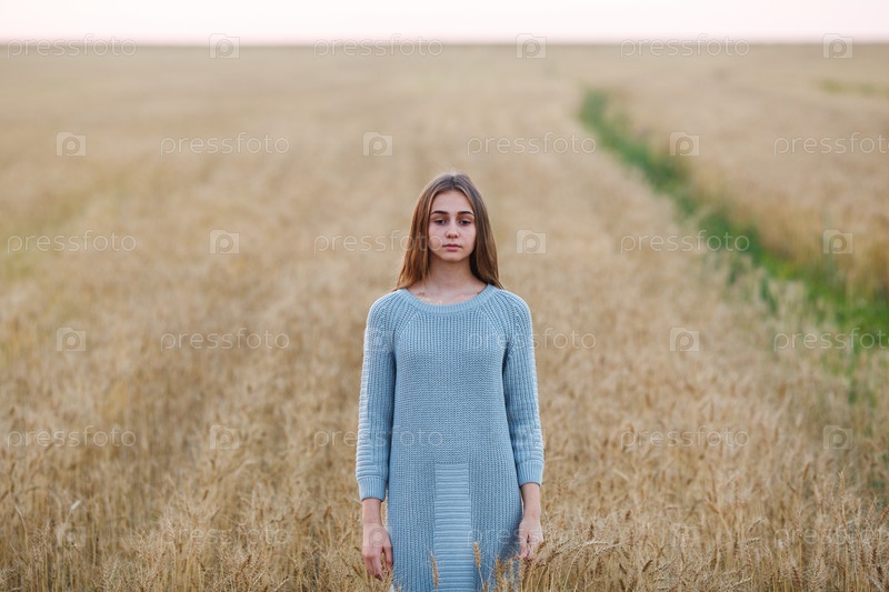 Красивая брюнеткав пшеничном поле на закате