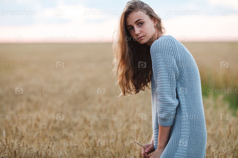 Красивая брюнеткав пшеничном поле на закате