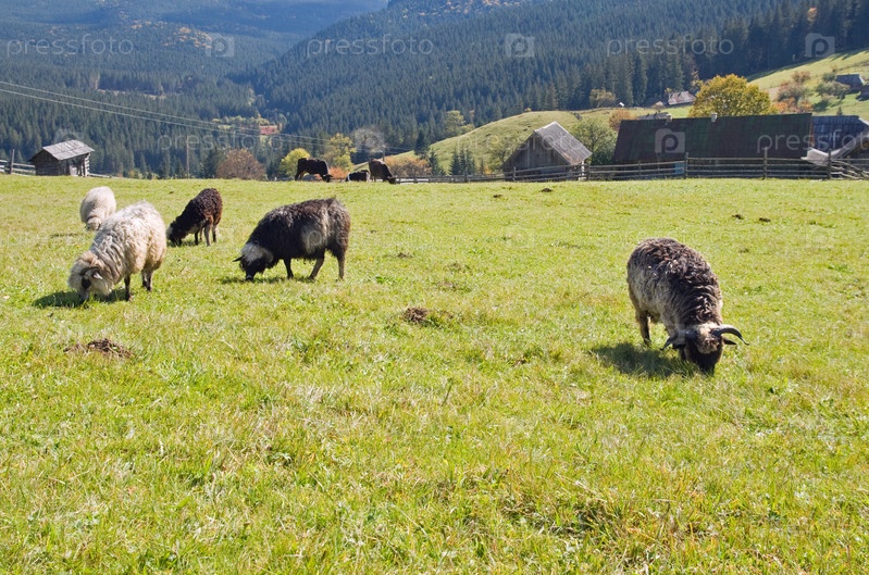 Овцы пасутся около высокогорного села, Карпаты, Украина