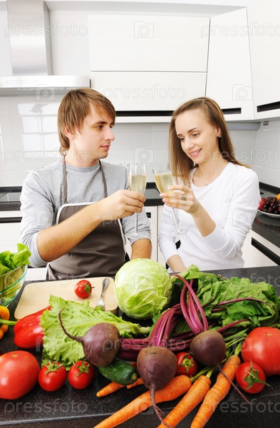 Молодая пара готовит вместе и пьет шампанское