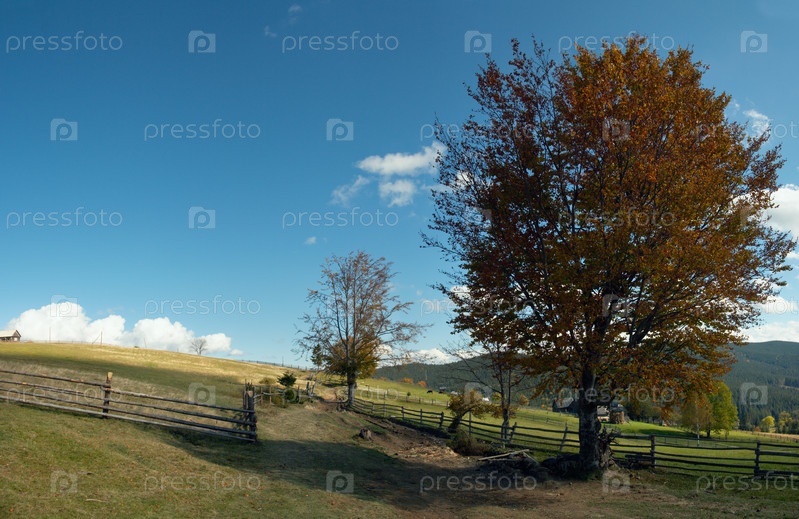 Осенний бук у дороги на пологом склоне, Карпаты, Украина