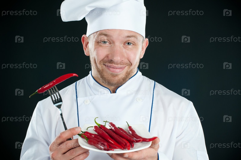 Улыбающийся шеф-повар с тарелкой перцев чили, темный фон