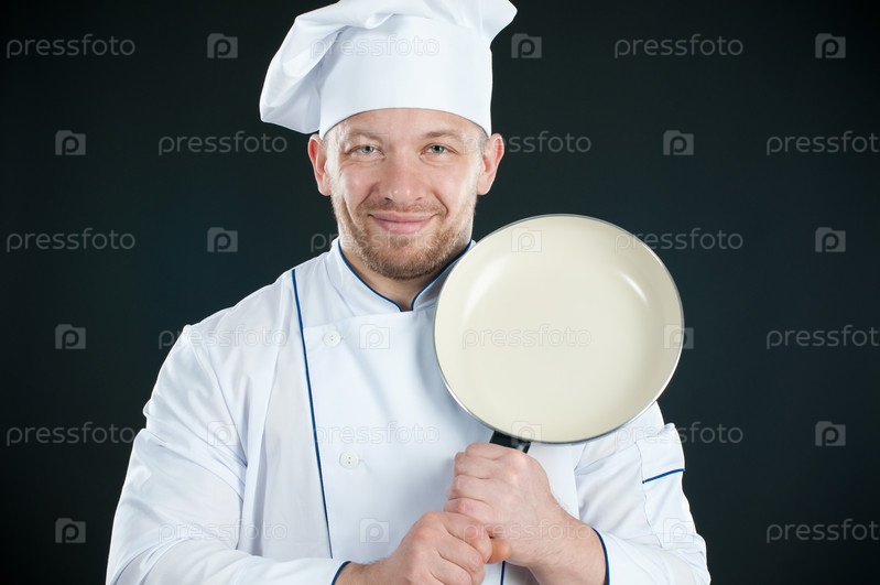 Улыбающийся шеф-повар со сковородкой в руках