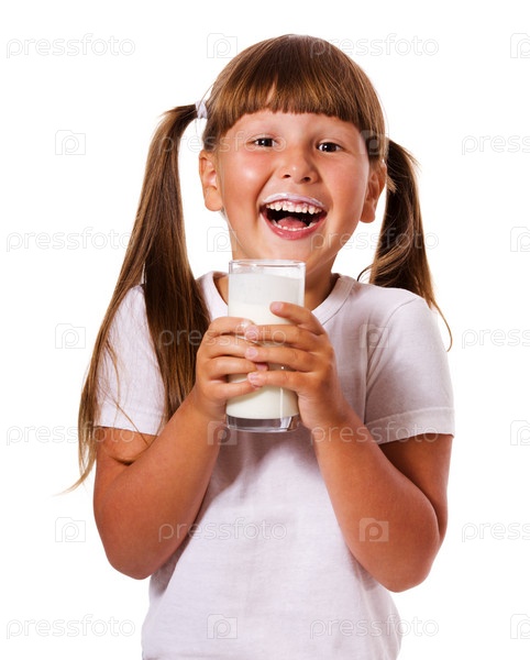 Девочка держит стакан молока на белом фоне