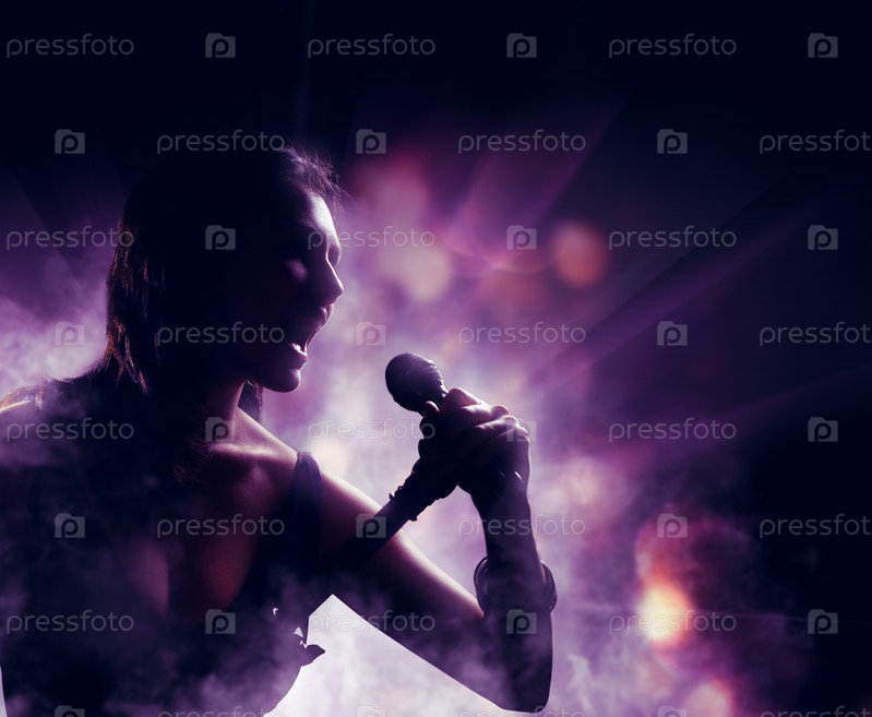 Силуэт поющей женщины на фоне огней