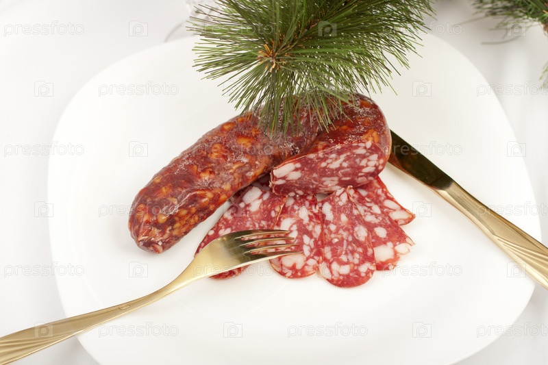 Закуска на новогоднем столе - сырокопченая колбаса