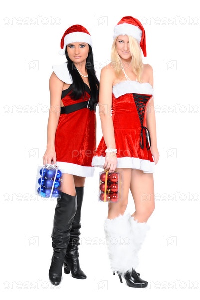 Девушки в новогодних костюмах с наборами рождественских украшений в руках