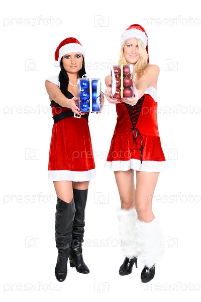 Девушки в новогодних костюмах с наборами рождественских украшений в руках