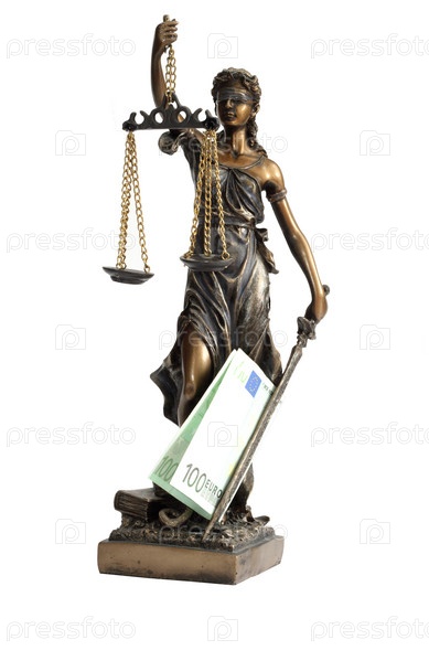 Статуя Фемиды и деньги на белом фоне