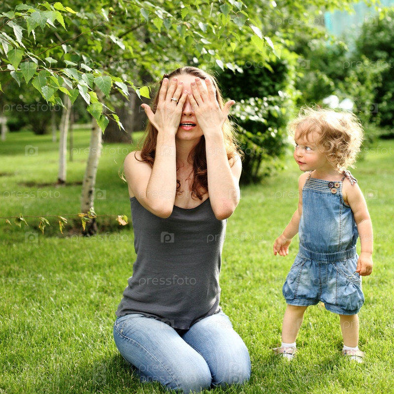 Семья играет в прятки в летнем парке