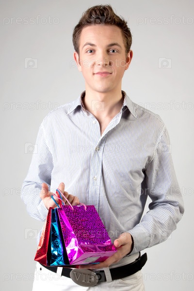 Улыбающийся парень с подарочными пакетами