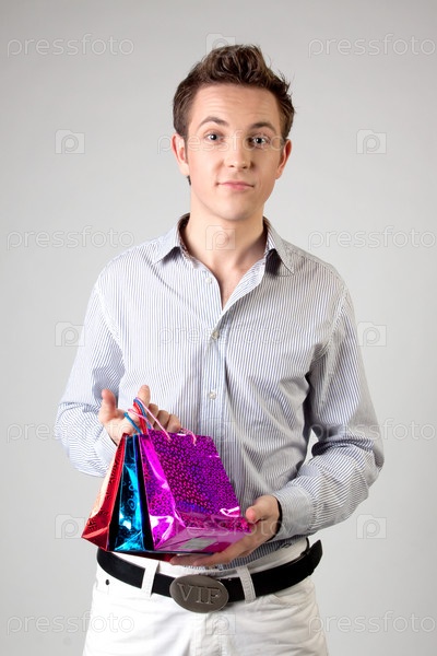 Улыбающийся парень с подарочными пакетами