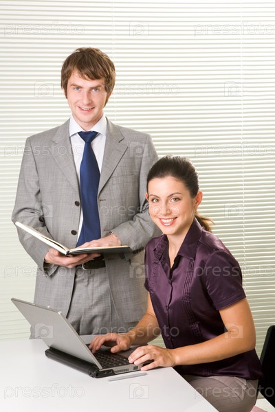 Портрет умных сотрудников, смотрящих на камеру с улыбкой во время работы в офисе