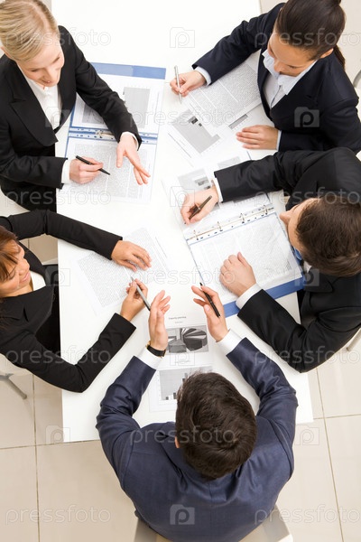 Сверху вид дружеской рабочей команды, обсуждающей новые идеи на встрече