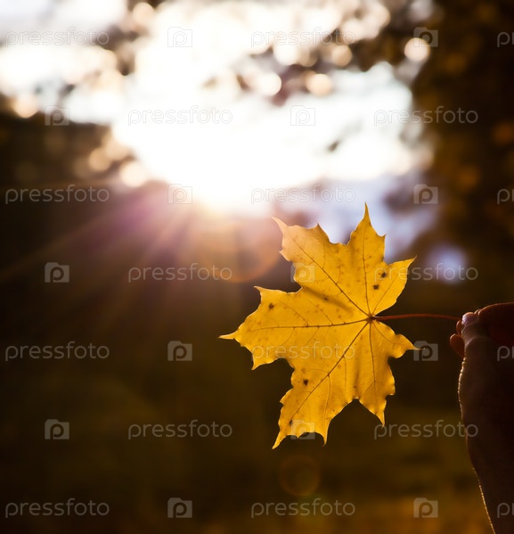 Желтый кленовый лист в руке против солнечного света