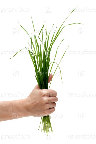 Кусок зеленой травы в руке на белом фоне
