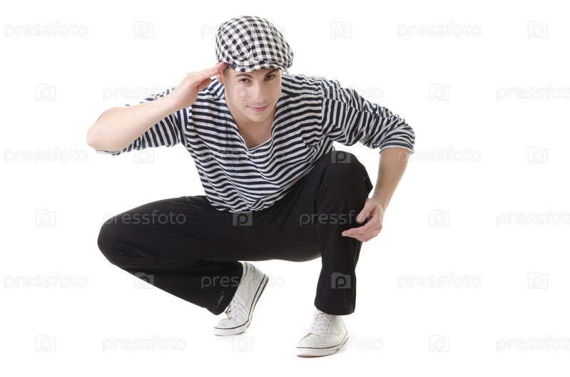 Стильный молодой человек в тельняшке и кепке, на белом фоне