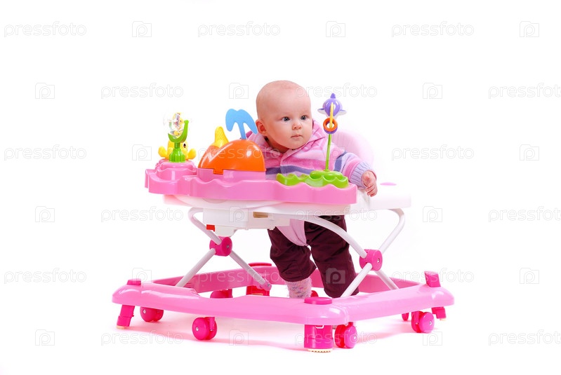 Малыш в ходунках на белом фоне