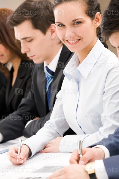 Успешная деловая женщина смотрит на камеру, работая между партнерами