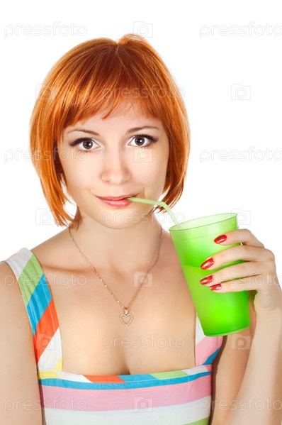 Молодая рыжая девушка пьет напиток из зеленого стакана с соломинкой