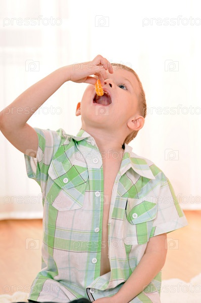 Ребенок сидит на полу и ест дольку апельсина