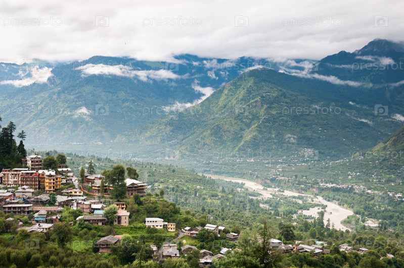 Долина с рекой между высокими горами. Северная Индия, Гималаи