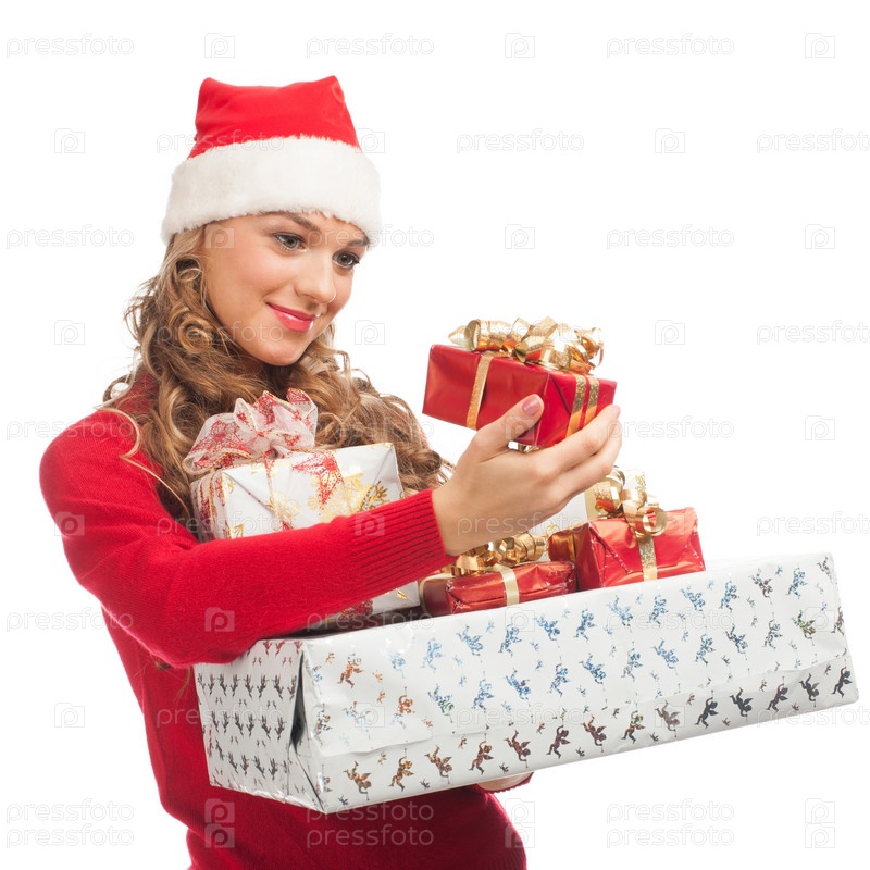 Молодая девушка в колпаке Санта-Клауса с рождественскими подарками на белом фоне