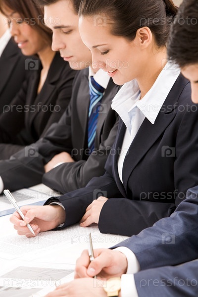 Фото красивой бизнес-леди, делающей заметки среди своих коллег на брифинге