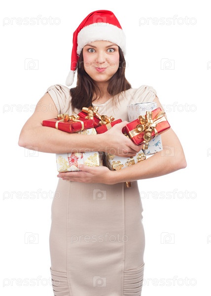 Молодая девушка в колпаке Санта-Клауса с рождественскими подарками на белом фоне