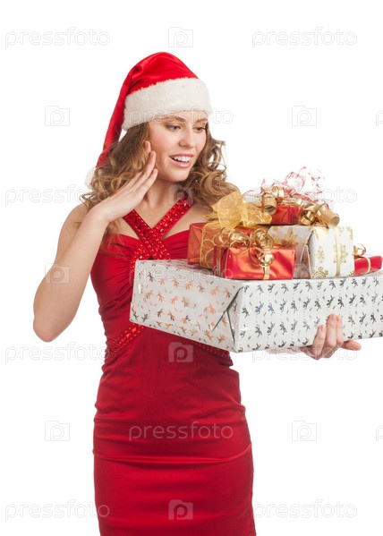 Молодая девушка в колпаке Санта-Клауса с рождественскими подарками на белом фоне