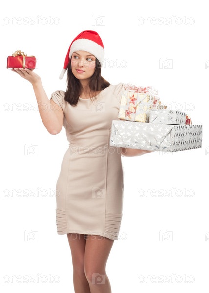 Молодая девушка в колпаке Санта-Клауса с рождественскими подарками на белом фоне