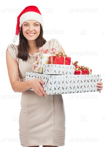 Молодая девушка в колпаке Санта-Клауса с рождественскими подарками на белом фоне