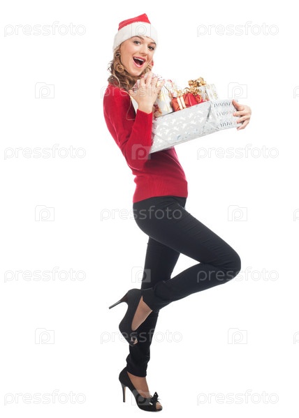 Молодая девушка в колпаке Санта-Клауса с рождественскими подарками на белом фоне